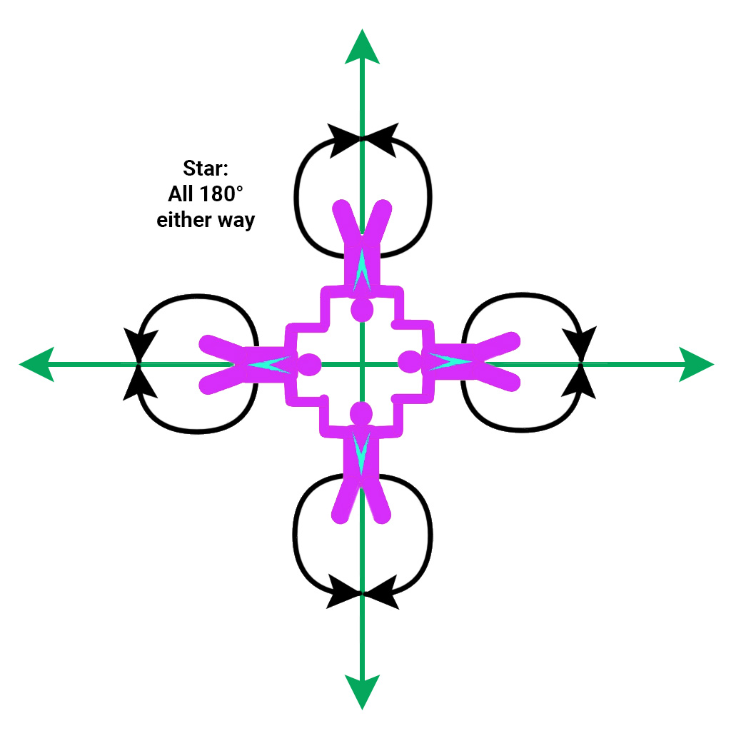 If you’re in a 4way star, turning 180° from the center of the formation should give each of you your own “radial” (similar to a spoke on a wheel) away from the center and equal separation from the jumpers on either side of you. Depending on the formation though, you may need to turn less to hit that same radial. For example, if you’re in a donut formation you may only need to turn about 90° to face away from the center. If you’re already facing outward in a bipole, you won’t need to turn at all. (Rocket launcher ENGAGED!!!)